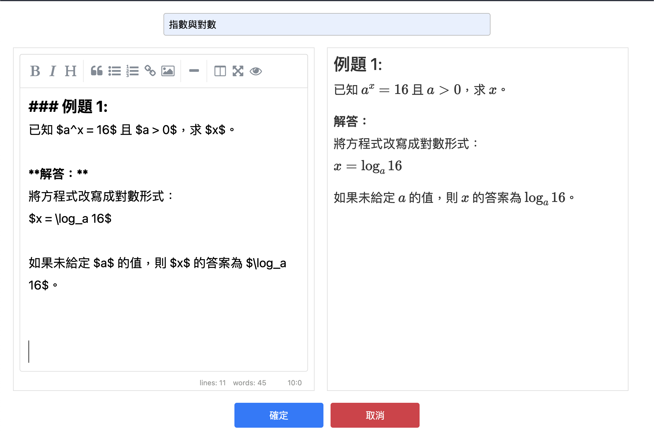 • 若在『編輯視窗』輸入Latex語法,可在『預覽視窗』瀏覽數學式或化學式的內容
