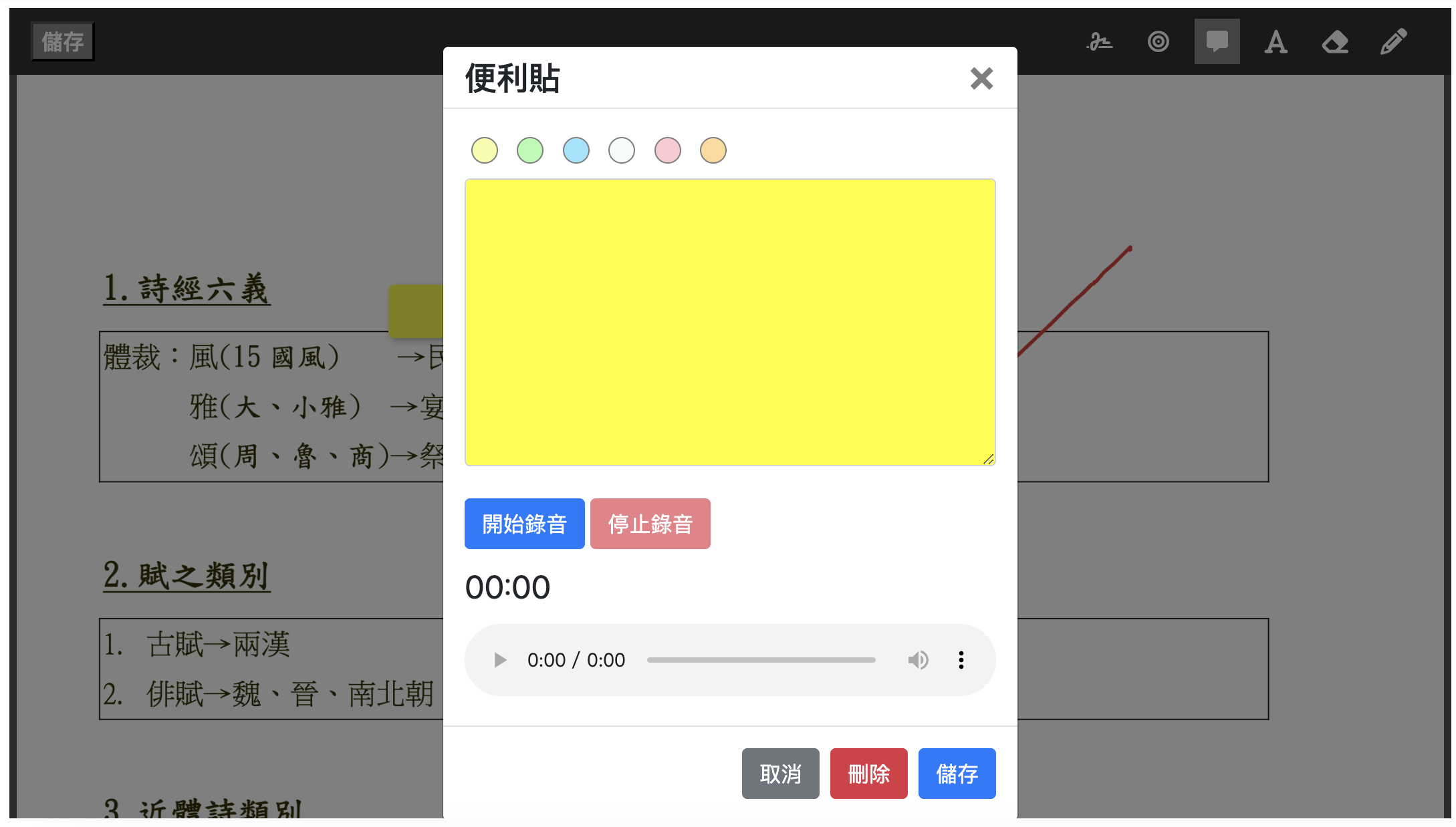 2.如果上傳的檔案是電子文件且有標注功能,則可直接劃線標注、輸入文字或使用『便利貼』留言或錄音